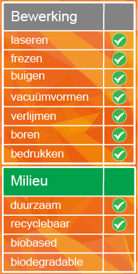 Bekijk in de tabel "Bewerkingen Acrylaat" nog eens overzichtelijk welke bewerkingen er toepasbaar zijn voor acrylaat. Daarnaast is in de tabel ook terug te vinden of acrylaat duurzaam, recyclebaar, biobased of biodegradable is.